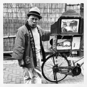 Se mantuvo como un método para contar historias durante varios siglos, pero posiblemente se le conozca más por su renacimiento en los años 1920. El gaito kamishibaiya, o cuentista, golpeaba dos pedazos de madera comúnmente unidos por una cuerda, llamadas hyoshigi, para anunciar su llegada a las diferentes villas. Los niños que compraban dulces a los gaito kamishibaiya tomaban los primeros asientos al frente del escenario. Una vez ubicada la audiencia, gaito kamishibaiya contaba varias historias utilizando para ello un pequeño escenario de madera que en la mayoría de los casos poseían muchos detalles artesanales en el que se insertaban ilustraciones que se iban removiendo a medida que se contaba la historia.